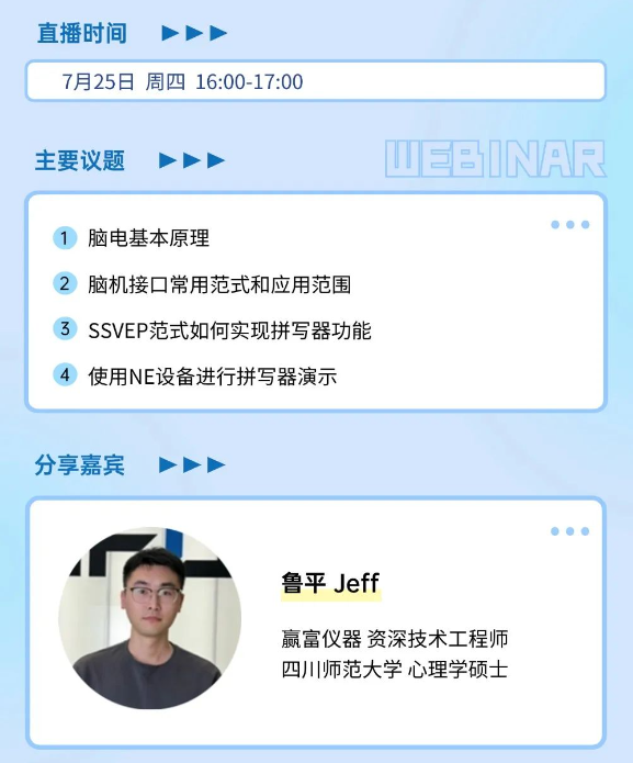 在本次研討會中,贏富儀器的資深技術工程師魯平Jeff將會分享NE的Enobio 無線腦電系統在腦機接口領域的應用,并基于SSVEP范式演示腦機接口拼寫器的實際應用效果。