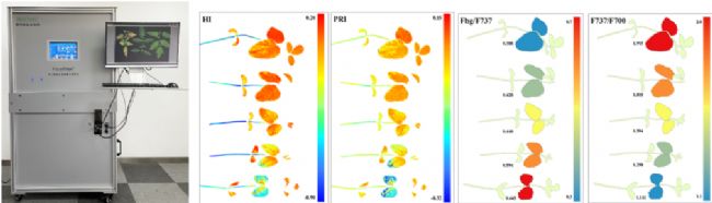 左圖:FluorTron®多功能高光譜成像分析系統;右圖:自左至右依次為:健康指數、PRI指數、藍綠熒光與葉綠素熒光比值指數、F737/F700(反映葉綠素含量)。可以看出,隨著自上至下施藥濃度的梯度增大,水培大豆苗受脅迫程度逐漸加重,其中UV-MCF成像最為靈敏(易科泰EcoTech®實驗室與中國農科院植保所合作項目)