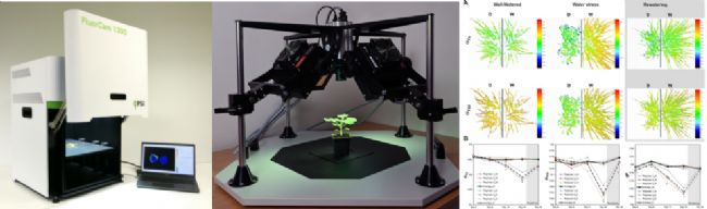 上左圖:FluorCam1300多光譜熒光成像系統;上中圖:模塊式葉綠素熒光動態成像系統;右圖:利用FluorCam技術研究大麥水分虧缺響應和復水恢復