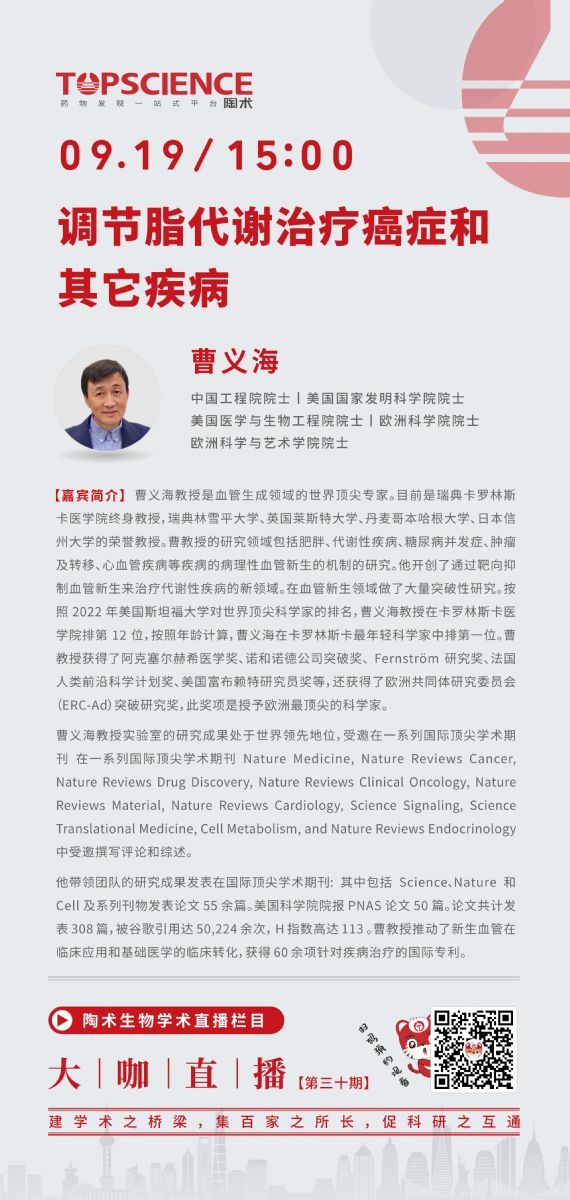 陶術(shù)生物第30期大咖直播將于 9月19日15點開播,現(xiàn)誠邀您參與觀看。本期我們隆重邀請到了 中國工程院院士 ——曹義海,為大家?guī)怼菊{(diào)節(jié)脂代謝治療癌癥和其它疾病 】的主題講座。