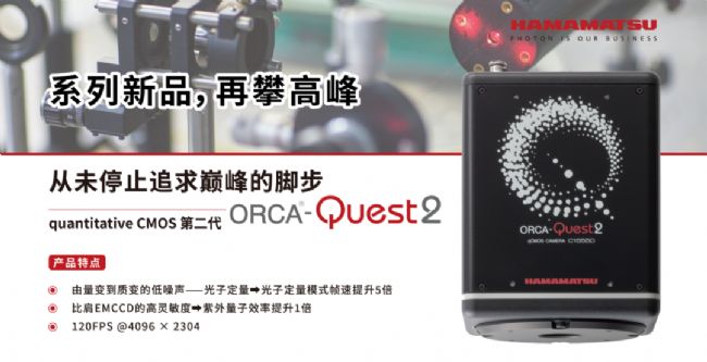 第一款是ORCA-Quest qCMOS第二代新品相機。qCMOS 相機在推出以來,已經(jīng)在眾多領(lǐng)域取代了EMCCD相機,并且在量子光學(xué)、材料光譜、X射線成像、超分辨成像等領(lǐng)域得到了廣泛應(yīng)用,在具有和EMCCD相同靈敏度的前提下,實現(xiàn)了高幀速和高分辨率。此次qCMOS第二代新品相機在一代的基礎(chǔ)上實現(xiàn)紫外量子效率提高1倍,低噪聲模式下更是幀速提高了5倍。