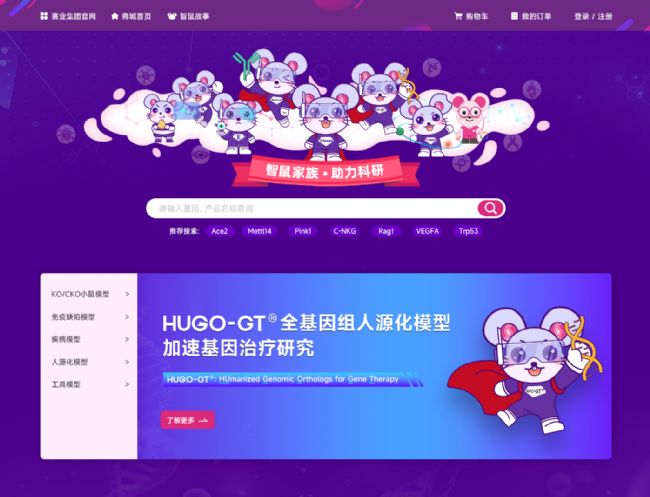 升級后的“智鼠”家族不僅包括“紅鼠”所代表的KO和CKO系列基因敲除小鼠,更涵蓋近五年研發的高端模型:以HUGO-Ab®為代表的全人源化抗體鼠系列產品,以HUGO-GT®為代表的更適合基因治療藥物研發的全基因組人源化模型,還包括服務數百家客戶的明星產品C-NKG重度免疫缺陷鼠系列產品,以及以VEGF轉基因小鼠、hRHO人源化小鼠為代表的眼科模型,以DMD小鼠為代表的神經肌肉疾病模型,以及自身免疫疾病模型DBA小鼠等。