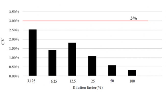 在CytScop®Pro儀器的最佳測試范圍內,對梯度稀釋CHO細胞樣本測試,CV<3%,說明儀器對各稀釋濃度均表現出了非常好的穩定性;R²>0.999, 說明儀器表現出良好的線性相關性。