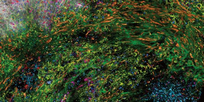 癌癥免疫學中的三維高倍成像。小鼠模型的胰腺腫瘤切片(1.8 x 0.8 毫米)概覽,使用 STELLARIS 和 SpectraPlex 對 15 個標記物進行標記并一次成像。