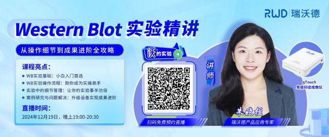 為解決大家在Western Blot實驗中遇到的這些難題,2024年12月19日晚上19:00-20:30,瑞沃德直播間將進行一場Western Blot實驗精講:從操作細節到成果進階全攻略!本場直播將教大家如何借助qTouch免疫印跡成像儀“通關打怪”,助您在學術道路上快人一步。
