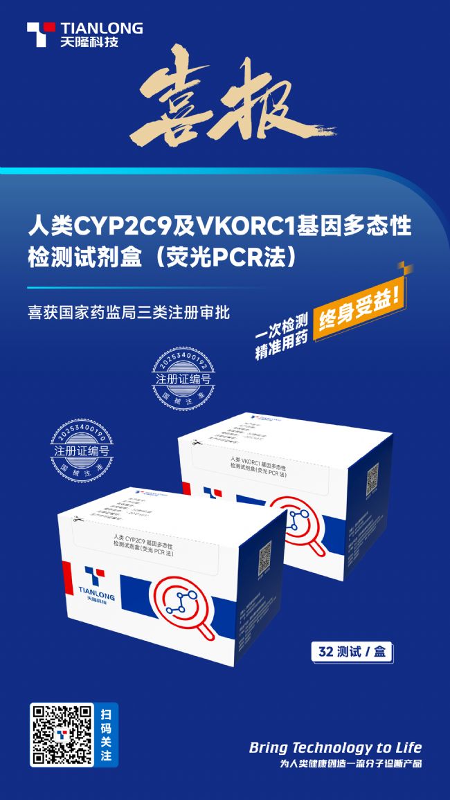 天隆科技自主研發的人類CYP2C9及VKORC1基因多態性檢測試劑盒(熒光PCR法)近日通過國家藥監局注冊審批,獲得三類醫療器械注冊證,天隆藥物基因家族再添新成員。