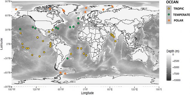 索邦大學的研究團隊使用MultiNet(浮游生物連續采樣網,德國,HYDRO-BIOS公司)和UVP5(水下顆粒物和浮游動物圖像原位采集系統,法國,HYDROPTIC公司)兩種設備在全球的57個站位(圖1)采集了浮游生物數據。