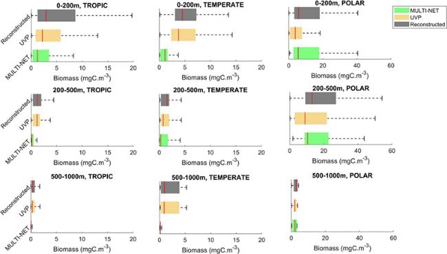 (2)生物量估計:重建的生物量在熱帶和溫帶地區顯著高于MultiNet的估計值(圖4),尤其是在表層水域中更為明顯。UVP5在獲取脆弱生物體(如根足蟲類)信息方面表現優異,而MultiNet在采集甲殼類動物方面更為有效。
