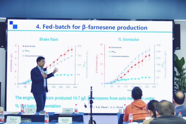 中國科學院大連化學物理研究所研究員周雍進老師帶來精彩報告,講訴“甲醇生物轉化”研究,以及分享借助AI技術從細胞工廠構建到發酵優化,提升了生物轉化的效率和精準度。