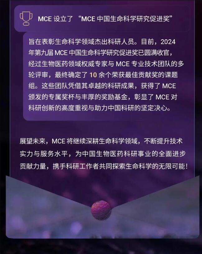 自 2016 年以來, “MCE 促進獎” 評選活動已連續開展八年之久,MCE 有幸與科研工作者們共同見證了中國生命科學領域的蓬勃發展。“MCE 生命科學研究促進獎” 旨在表彰科研人員對生命科學領域作出的杰出貢獻。此外,MCE 希望能支持更多科研團隊或個人的科學探索工作,助力各位攀登科學之高峰!