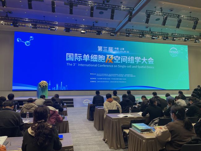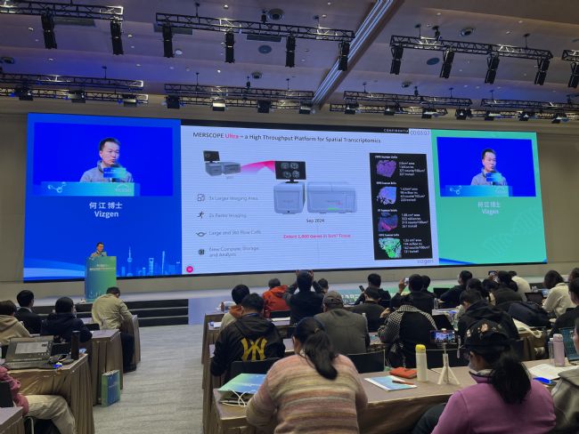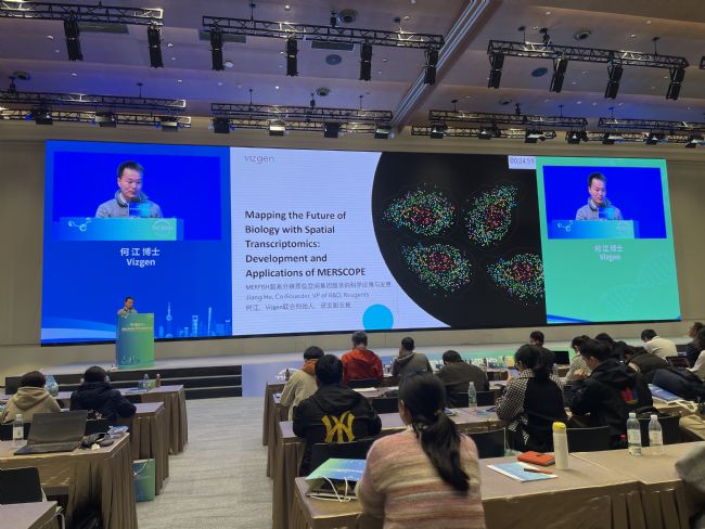 圖2. 第三屆TICSSO國際單細胞及空間組學(xué)大會現(xiàn)場。森西賽智科技聯(lián)合Vizgen亮相兩次會議,重磅發(fā)布長期保存樣本空轉(zhuǎn)方案:MERFISH 2.0。Vizgen生物科技公司聯(lián)合創(chuàng)始人兼研發(fā)副總裁何江博士在大會上做了題為“MERFISH超高分辨原位空間基因組的科學(xué)應(yīng)用及發(fā)展”的主題報告。