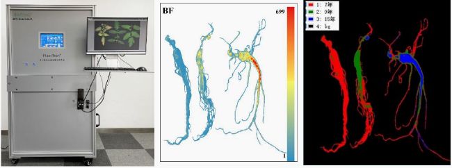 左圖:FluorTron®多功能高光譜成像分析系統;中圖:藍色熒光指數;右圖:根據UV-MCF高光譜數據所做隨機森林分類結果。可以看出,7年、9年、15年三支不同年份西洋參的差異在藍色熒光指數圖中表現顯著,年份越久,西洋參的藍色熒光越強,根據UV-MCF高光譜數據所做隨機森林分類結果圖來看,不同年份的差異主要集中在參體,可通過此模型對不同年份西洋參進行年份鑒定(易科泰EcoTech®實驗室與東北林業大學合作項目)。