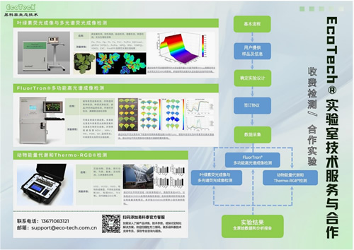 易科泰生態技術公司設有EcoTech實驗室,承接中草藥材的葉綠素熒光成像與多光譜熒光成像檢測、FluorTron®多功能高光譜成像檢測、動物能量代謝和Thermo-RGB®檢測,歡迎合作!