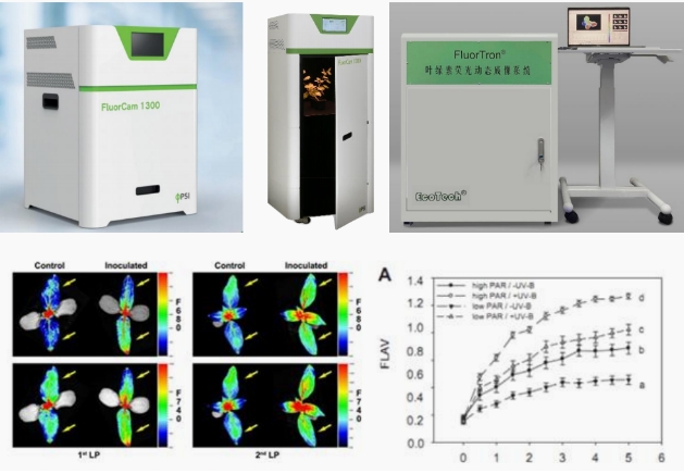 上圖從左到右依次為:FluorCam1300植物多光譜熒光成像分析系統標準版,FluorCam1300植物多光譜熒光成像分析系統大型版,FluorTron葉綠素熒光動態成像系統;下圖為高光與紫外光培養對積雪草的葉綠素熒光(F680和F740)的影響以及黃酮類化合物(FLAV)含量影響,可以看出高光和高紫外光協同作用下積雪草的黃酮類化合物積累最多,其次為低光和高紫外光處理,然后是高光和低紫外光處理,而低光和低紫外光處理的黃酮類化合物最少,說明紫外光對積雪草積累黃酮類化合物有著重要促進作用