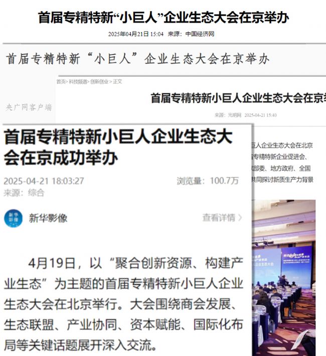 2025年4月19日,以“聚合創新資源、構建產業生態”為主題的首屆專精特新小巨人企業生態大會在北京舉行。大會由北京、山西、河南、吉林等20余家專精特新企業商會共同主辦,匯聚了來自國家部委、地方政府、全國專精特新商協會、優秀專精特新企業、金融機構、科研單位的380位代表,共同探討新質生產力背景下專精特新“小巨人”企業的創新發展與生態構建之路。新華社、央廣網、光明網、中國經濟網等20多家主流媒體對會議進行了全程跟蹤報道。