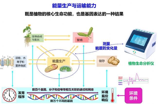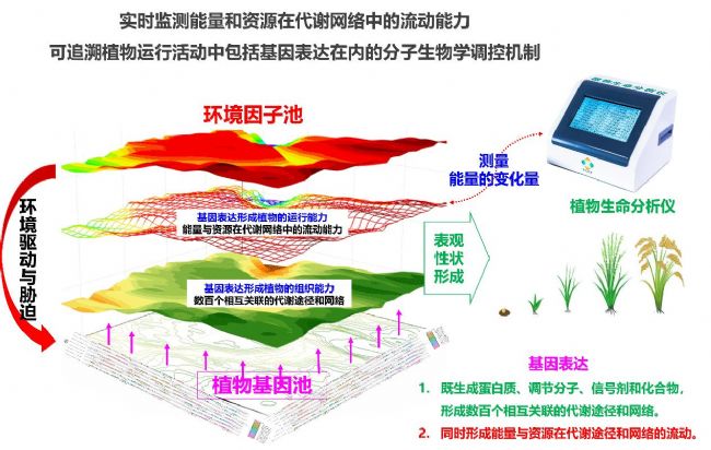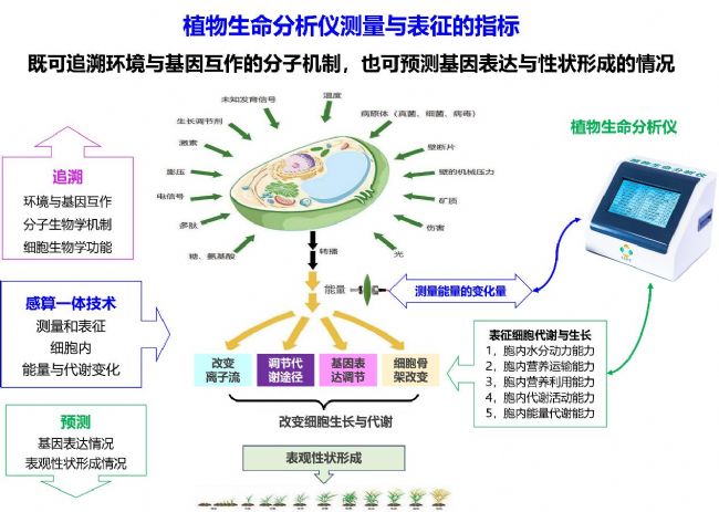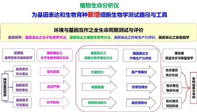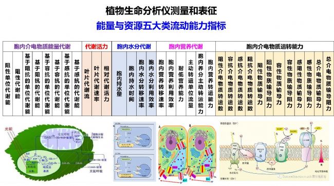 植物生命分析儀能夠測量與表征能量與資源五大類50余個流動性能力指標(圖六),這五大類50余個流動性能力指標可以幫助科學家追溯環境與基因互作的分子機制,以及可預測基因表達與性狀形成的情況(圖七)。例如,植物生命分析儀可以為基因表達和生物育種新增細胞生物學測試路徑與工具(圖八),可以幫助科學家系統解析植物生長發育及功能形成的生命過程機制,為科學家認識植物生命活動規律打開了新窗口(圖九)。
