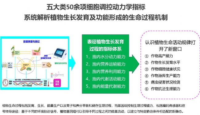吳沿友研究員帶領十八位碩士、六位博士和三位博士后,通過10余年潛心研究與探索,經大量實驗與理論推導證實(在國際重要期刊上發表30余篇論文,發表了25篇碩士博士論文,授權了30余件國家發明專利),植物內基于電子能的內能變化量可表征生命活動過程。首創基于熱力學方程的感算一體技術,發明了植物生命分析儀,實現對細胞內能量變化的實時監測分析,建立50余項細胞調控動力學指標,系統解析植物生長發育及功能形成的生命過程機制,創新地解決了能量存儲轉換與物質運輸代謝耦合難題。