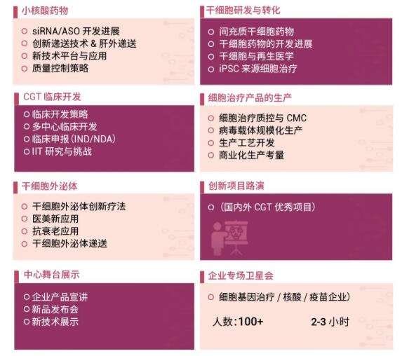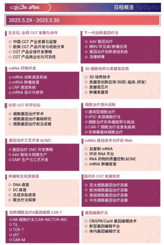 CGCS 2025 將繼續(xù)聚焦中美歐洲亞太地區(qū) CGT 法規(guī)、細(xì)胞治療臨床&研發(fā)&生產(chǎn)全流程、CAR-T 商業(yè)化、新型 CAR-NK、TCR-T、TIL、AAV 基因治療、干細(xì)胞藥物、類器官與 3D 細(xì)胞培養(yǎng)、溶瘤病毒開發(fā)、mRNA 療法、小核酸藥物開發(fā)、腫瘤新抗原 疫苗、外泌體研究進(jìn)展等前沿技術(shù)趨勢(shì)。
