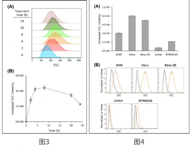 高效細(xì)胞分析: 在后續(xù)的細(xì)胞攝取實(shí)驗(yàn)中,基于ApogeeFlow建立的校準(zhǔn)曲線(xiàn),研究者使用常規(guī)流式細(xì)胞儀(BD FACSVerse™)即可快速、高通量地分析多種細(xì)胞系(A549, HeLa, Beas-2B, Jurkat, RPMI8226)對(duì)金顆粒的攝取量和動(dòng)力學(xué)(圖3, 4),完美銜接了納米顆粒表征與復(fù)雜生物系統(tǒng)研究。