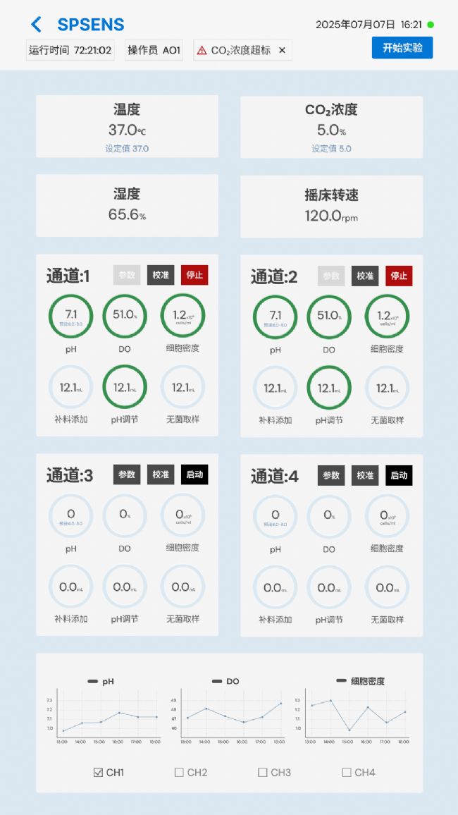 屏界面實時顯示 pH、DO 和細胞密度參數