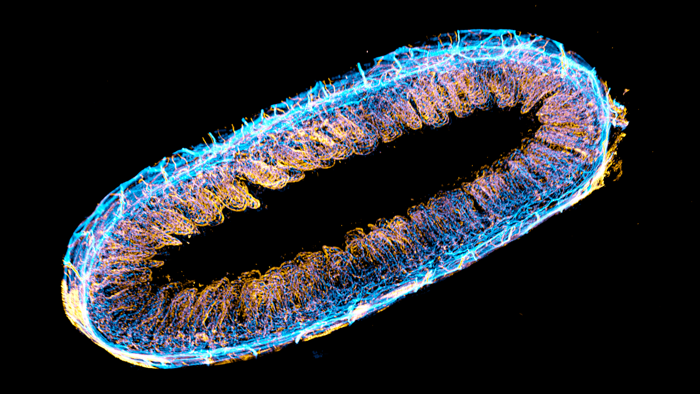 300um透明化小腸切片,金色標記血管,藍色標記神經,25x物鏡拍攝