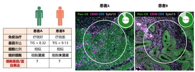 DSP空間組學測序助力闡述機制:同類型細胞(如CD45+免疫細胞)在響應不同(A療效好;B療效差)的樣本中轉錄組和蛋白組有什么差異。