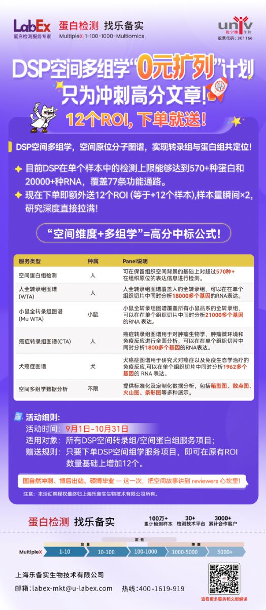 開學季促銷大放送,LabEx_DSP空間多組學“0元擴列”計劃限時開啟(9.1-10.31),直接免費贈送老師12個ROI的測序數據(相當于12個“sample”),史上最低價!