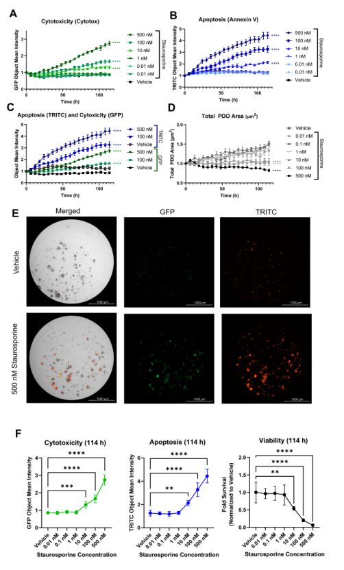 通過熒光標記和自動化成像,研究團隊成功實現了對 PDOs 在不同藥物處理下的生長、凋亡和毒性等關鍵指標的實時監測與量化。