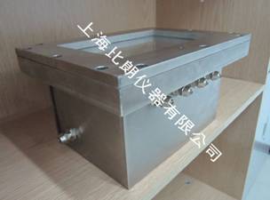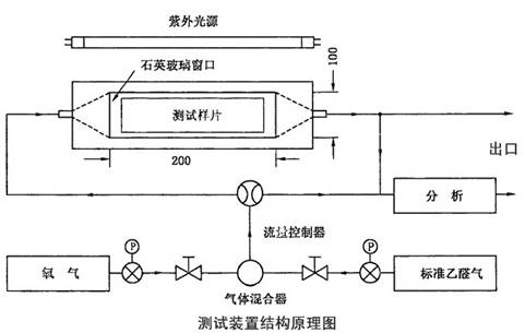 氣體光催化裝置是一全密閉的反應器,其內部裝有200mm*100mm大小,外部可調節高度的支撐塊,測試樣片放置在支撐塊上。支撐塊上方有一與其平行的光路窗口,反應器外部的紫外光通過此窗口照射到樣片表面。通過調節支撐塊的高度使得樣片表面與窗口之間的距離大于5.0mm。反應氣只能在樣片表面和窗口之間通過。光路窗口材料可選用石英玻璃或硼玻璃。