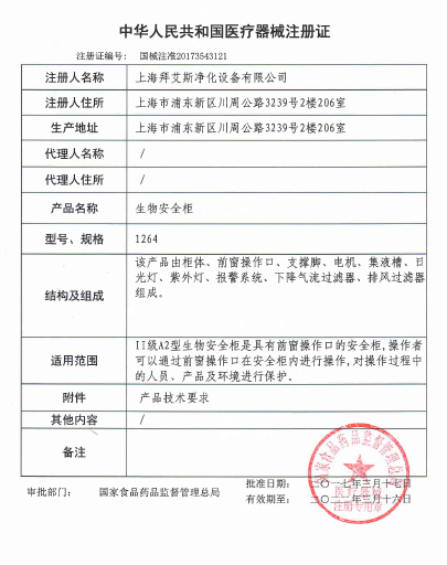 上海組裝工廠的生物安全柜已獲得中華人民共和國CFDA頒發(fā)的產(chǎn)品注冊證;我們拿到了醫(yī)療器械市場的入場劵;可以更好地為醫(yī)護人員服務!