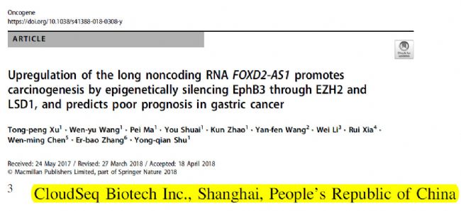 Tong-peng Xu, et al. Upregulation of the long noncoding RNA FOXD2-AS1 promotes carcinogenesis by epigenetically silencing EphB3 through EZH2 and LSD1, and predicts poor prognosis in gastric cancer. Oncogene (2018), http://sci-hub.tw/10.1038/s41388-018-0308-y