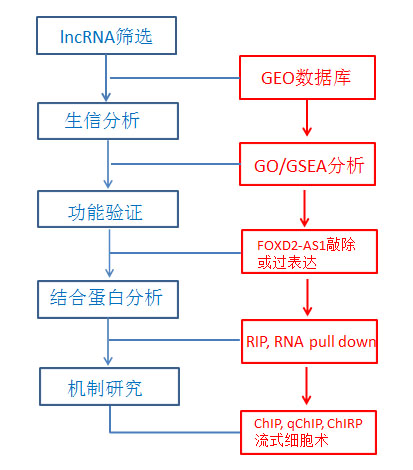 此次云序生物和南京醫科大的研究團隊對FOXD2-AS1在胃癌進展中發揮的功能以及調控的相關生物學機制進行了深入研究,其思路和方法值得我們借鑒。本研究中,首先比較了GEO數據庫中GC和正常胃組織的lncRNA表達譜,發現了一種新的lncRNA FOXD2-AS1在GC中顯著過表達。深入分析發現FOXD2-AS1在GC中的上調與腫瘤大小、癌癥發展階段以及不良預后存在正相關關系。RACE分析和Sanger測序表明,該轉錄本增加了兩個外顯子。GO和GSEA分析顯示其與細胞周期和DNA復制顯著相關,FOXD2-AS1的敲除和過表達進一步驗證了生信分析結果。RIP和RNA pull down結果表明FOXD2-AS1與EZH2和LSD1蛋白結合。WB結合IHC證實了FOXD2-AS1與EphB3的相關性,并且利用ChIP、qChIP和ChIRP技術結合流式細胞術以及生信分析的手段,證明FOXD2-AS1通過將EZH2和LSD1引入到EphB3的啟動子中,抑制其轉錄。至此,成功揭示了FOXD2-AS1通過EZH2和LSD1介導的EphB3下調促進胃癌發生的新機制。