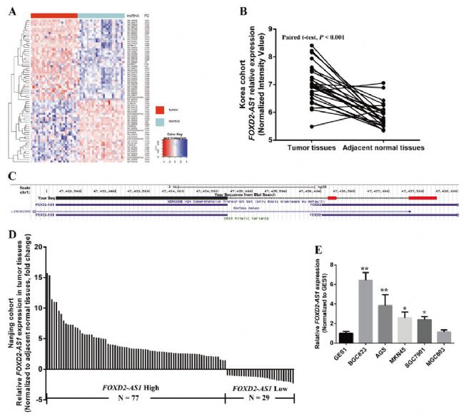 研究者利用現有芯片數據分析26對癌癥和非癌組織發現lncRNAs中41個表達上調,71個表達下調,其中H19,UCA1,PVT1和FOXD2-AS1在胃癌中上調顯著。為了評價lncRNA在GC中的作用,我們選擇了FOXD2-AS1,顯著P-Values和False discovery rate (FDR)分析表明FOXD2-AS1在GC組織中上調最為顯著。RACE分析和Sanger測序揭示其全聚(A)陽性序列和基因大。3057bp)。UCSC和CPC分析證實FOXD2-AS1沒有蛋白編碼能力。檢測106例受試者中FOXD2-AS1的表達水平,對比癌組織/癌旁組織(T/N)比值,結果顯示FOXD2-AS1在GC組織中的表達量約70%。RT-qPCR驗證發現多種胃癌組織中FOXD2-AS1富集顯著增加。并且FOXD2-AS1的表達水平與腫瘤大小、浸潤性及腫瘤階段呈正相關。