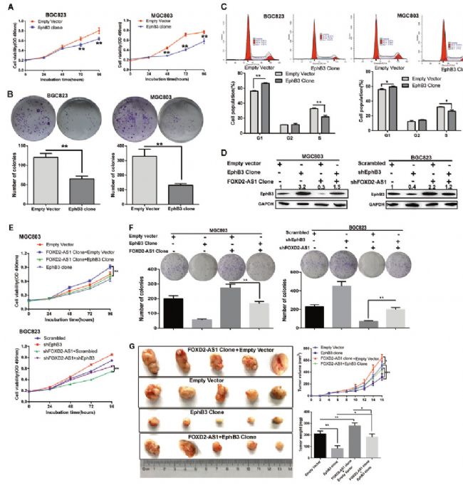 數據顯示,相對于正常組織,GC組織中對EphB3的富集顯著降低,低的EphB3表達表明疾病進展。此外,將FOXD2-AS1與EphB3表達結合,可獲得較好的預后價值。使用IHC對106個匹配的GC及周圍正常組織的EphB3蛋白水平進行了評估,發現在約80%的非瘤性胃組織中,EphB3信號呈陽性,且這些腫瘤組織與周圍正常組織相比,大多表現出較低的EphB3蛋白表達。此外,EphB3蛋白表達水平越低,疾病階段越晚期。上述結果表明,低EphB3表達與GC進展有關。EphB3轉染實驗顯示EphB3與FOXD2-AS1誘導的GC細胞增殖有關。拯救實驗驗證了FOXD2-AS1通過阻斷EphB3表達來調控GC細胞生長。