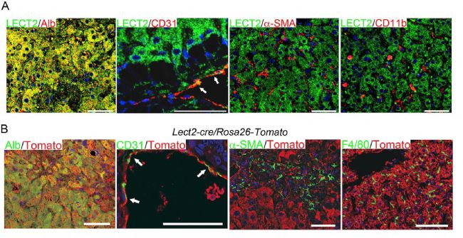 接著,作者利用Lect2-Cre/Rosa26-Tomato小鼠模型進行體內實驗,結果表明LECT2蛋白主要存在于肝細胞和內皮細胞中,在肝星狀細胞和巨噬細胞中不表達(Fig.2)。