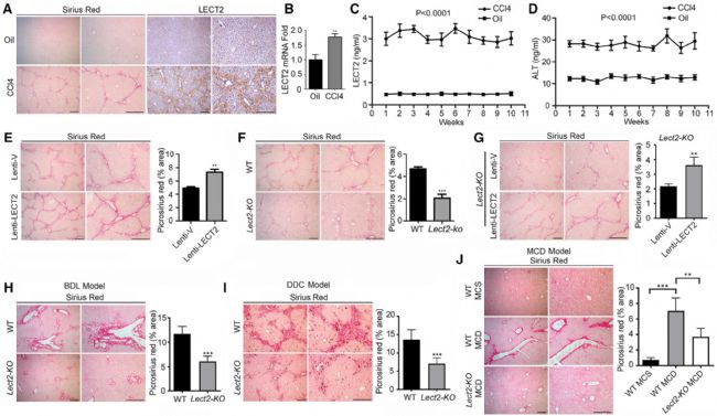 接著,作者結合過表達或者敲除小鼠模型以及多種纖維化小鼠模型發現,LECT2蛋白水平與肝纖維化水平出現正相關關系,即LECT2過表達小鼠肝纖維化加重,Lect2基因敲除小鼠肝纖維化病情減輕(Fig.3)。