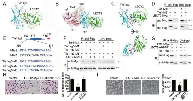 作者通過研究基因功能及蛋白結構發現,LECT2作為一種白細胞衍生的趨化因子,能夠與血管內皮細胞Tie1受體直接結合(Fig.4)。