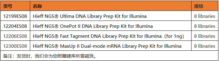 為了拓寬NGS技術的應用領域,尤其是在醫(yī)學領域的科研攻關,推動NGS技術應用的高速發(fā)展,即日起至3月底,翊圣生物向廣大科研客戶免費提供高通量測序建庫試劑,產(chǎn)品清單如下,每款試劑盒可供8次建庫使用,在您選擇試劑盒后,我們會附贈建庫所需磁珠,供您完成完整建庫: