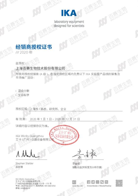 上海百賽生物從2015年簽訂IKA授權以來,一直是IKA中國區最大的授權代理商之一,即A級代理商。