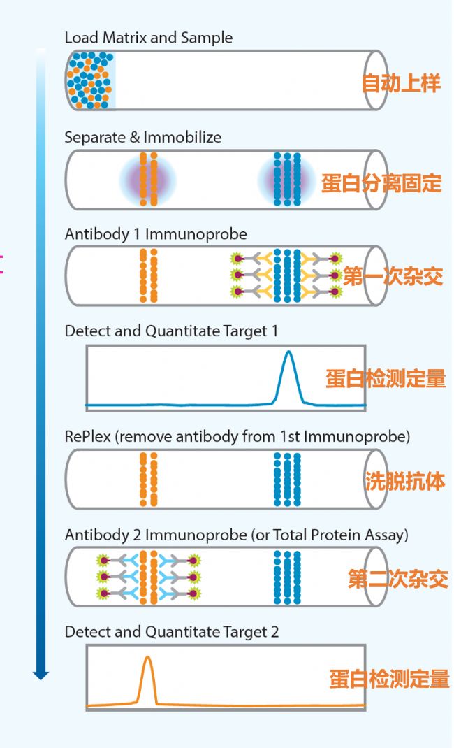 傳統(tǒng)Western Blot若從單個(gè)樣本中獲取更多的蛋白信息,即為了節(jié)省珍貴或昂貴的樣品,需要進(jìn)行strip-reprobe(洗脫-重雜交)。然而,眾所周知該技術(shù)會(huì)遭受不可預(yù)測(cè)的蛋白質(zhì)損失,并且通常需要冗長(zhǎng)的優(yōu)化以實(shí)現(xiàn)最佳的剝離效率并使蛋白質(zhì)在印跡上的保留最大化。這使得幾乎不可能使用標(biāo)準(zhǔn)的條帶和探針技術(shù)進(jìn)行任何定量分析。相比之下,Simple Western平臺(tái)Jess開發(fā)的RePlex技術(shù)是一種優(yōu)化的自動(dòng)化兩步免疫分析,可以實(shí)現(xiàn)多個(gè)靶標(biāo)的高效抗體去除和出色的目標(biāo)蛋白在樣品毛細(xì)管中的保留,從而可以實(shí)現(xiàn)在一個(gè)樣品中獲得更多的蛋白信息。