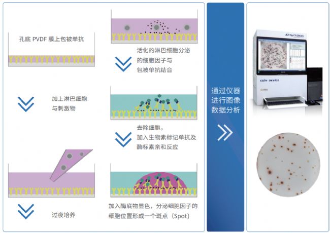 ELISPOT的實驗原理和流程如圖2所示,通過捕獲抗體和檢測抗體,和待測細(xì)胞因子形成“三明治夾心”,加入酶底物顯色,分泌細(xì)胞因子的細(xì)胞位置形成“斑點”,用儀器對形成的“斑點”進行成像和計數(shù)分析。所用儀器就是“酶聯(lián)免疫斑點圖像分析儀”。