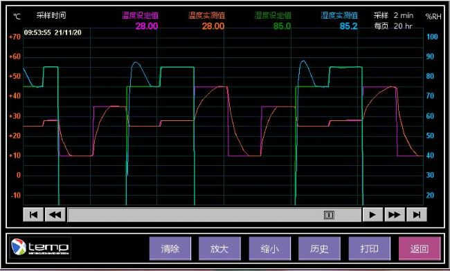 - 國家發明專利(201210145259.6)的制冷量控制裝置,溫度波動度 ±0.2 °C,濕度波動度± 3 %RH,實時顯示溫度和相對濕度變化的曲線