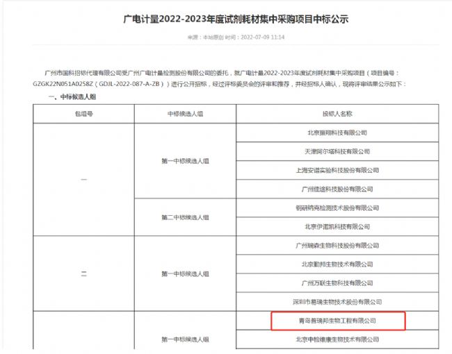 2022年7月9日,廣電計量2022-2023年度試劑耗材集中采購項目中標公示(項目編號:GZGK22N051A0258Z(GDJL-2022-087-A-ZB)),普瑞邦生物憑借專業的技術服務、過硬的產品質量、高效的響應速度在眾多廠商中脫穎而出,以第一后選人中標包組三(凈化填料及凈化小柱)。