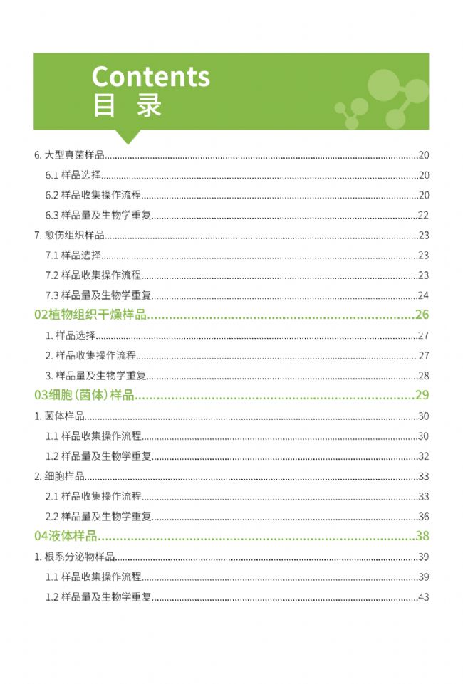 本手冊涵蓋了用于代謝組學、蛋白質組學等組學檢測常見的植物組織鮮樣樣品、植物組織干燥樣品、細胞(菌體)樣品、液體樣品、土壤樣品的取樣收集步驟,其中包含了樣品的選擇、樣品收集操作詳細流程和樣品量及生物學重復。