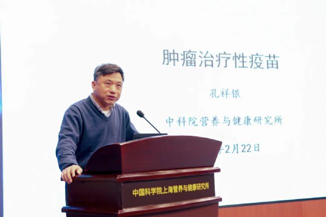 接著,中國科學院上海營養與健康研究所學術委員會副主任孔祥銀研究員進行了主題為《腫瘤治療性疫苗》的前沿報告。孔祥銀研究員從“疫苗”出發,介紹了腫瘤新抗原的特點及其臨床應用,強調了目前腫瘤新抗原所面臨的挑戰——腫瘤新抗原預測,對腫瘤新抗原的選擇進行了詳細的闡述,并為大家分享了腫瘤疫苗相關技術的創新成果。