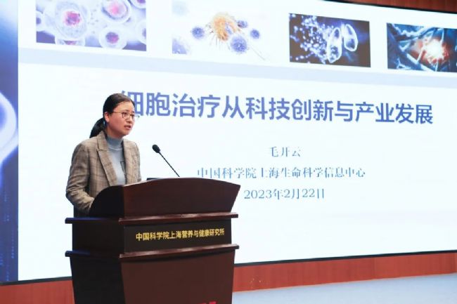 隨后,中國科學院上海營養與健康研究所生命科學信息中心毛開云副研究員圍繞《細胞治療從科技創新到產業發展》主題進行了詳細的闡述。毛開云副研究員從科技創新與產業發展角度,深入淺出地講解了細胞治療的研究、發展現狀及應用,強調了細胞治療發展的關鍵因素:技術突破、臨床需求、政策支持及市場定價;最后她介紹了細胞治療創新鏈和產業鏈相互滲透高度融合的發展趨勢、企業自建平臺與通用型細胞制備平臺相結合模式的發展前景,并表示細胞治療在成本與定價問題還需要逐步解決。