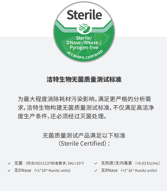 為確保低吸附微量離心管產(chǎn)品品質(zhì),該系列產(chǎn)品均嚴(yán)格遵循PCR潔凈測(cè)試標(biāo)準(zhǔn)和無(wú)菌質(zhì)量測(cè)試標(biāo)準(zhǔn)。