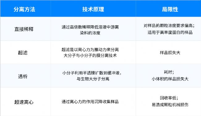 在外泌體、病毒等生物樣本的生化指標分析中,熒光抗體、熒光染料的標記往往是必不可少的實驗操作手段。然而,標記后游離染料的殘留卻常常成為樣本分析的“隱形殺手”。它們往往會引入高的熒光背景、淹沒樣本的真實信號,導致我們的研究偏離真實結果。因此,去除這些游離染料至關重要。常用的去除游離染料的方法有:直接稀釋、透析、超濾、超速離心等,但這些方法往往需要昂貴的設備,并且存在操作繁瑣、樣本回收率低、游離染料殘留等限制(表1)。