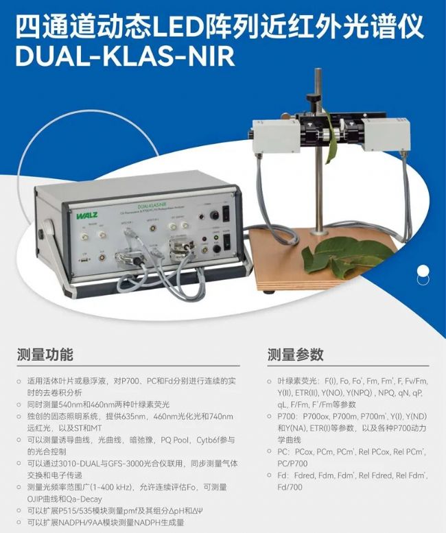 新技術(shù)的推出可以填補目前光合作用測量技術(shù)的空白,如在前幾年推出的四通道動態(tài)LED陣列近紅外光譜儀DUAL-KLAS-NIR,可以同步測量葉綠素?zé)晒猓琍700(光系統(tǒng)Ⅰ),PC(質(zhì)體藍素),F(xiàn)d(鐵氧還蛋白)的氧化還原。葉綠素?zé)晒鉁y量不再僅僅局限于葉片表層,特有的綠色測量光可以測量葉片深層光合機構(gòu)的葉綠素?zé)晒狻H嫦到y(tǒng)的測量PSⅡ和PSⅠ可以更好地解釋光合控制是如何協(xié)調(diào)兩個光系統(tǒng)能量吸收與利用的。