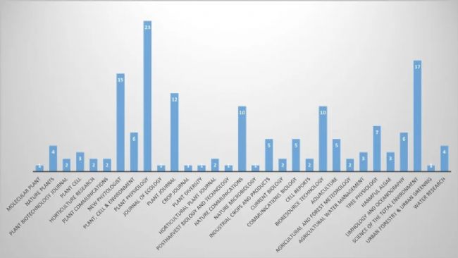 參考最新的中科院文獻期刊分區(qū)表,植物科學(xué),園藝,農(nóng)林期刊1區(qū)雜志文章Nature Plants,4篇;Molecular Plant,1篇;Plant Biotechnology Journal,2篇;Plant Cell,3篇;Horticulture Research,2篇;Plant Communications,2篇;New Phytologist,15篇;Plant, Cell & Environment,6篇;Plant Physiology,23篇;Journal of Ecology,1篇;Plant Journal,12篇;Crop Journal,1篇;Plant Diversity,1篇;Horticultural Plant Journal,2篇;Postharvest Biology and Technology,1篇;Nature Communications,10篇;Nature Microbiology1篇;Industrial Crops and Products,5篇;Current Biology,2篇;Communications Biology,5篇;Cell Reports,2篇;Bioresource Technology,10篇;Aquaculture,5篇;Agricultural and Forest Meteorology,2篇;Agricultural Water Management,3篇;Tree Physiology,7篇;累計128篇。環(huán)境科學(xué)類一區(qū)期刊文章Harmful Algae,3篇;Limnology and Oceanography,6篇;Science of The Total Environment,17篇;Urban Forestry & Urban Greening,1篇;Water Research,4篇,共計31篇。